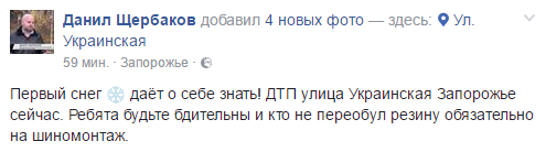 — Первый снег дает о себе знать! ДТП улицa Украинская Запорожье сейчас. Ребята будьте бдительны и кто не перeобул резину обязательно на шиномонтаж, — пишет Щербаков.