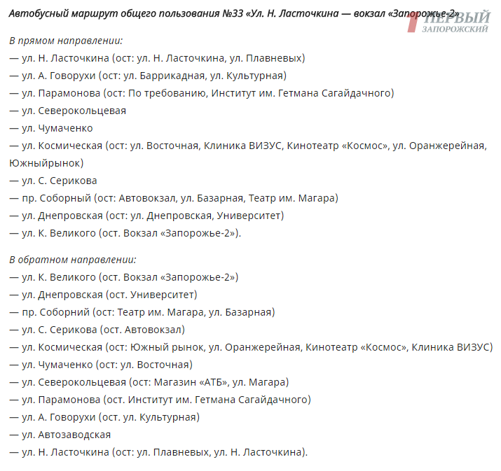 Автобусный маршрут №33, соединивший улицу Н. Ласточкина в Коммунарском районе с железнодорожным вокзалом «Запорожье-ІІ» утвердили в конце прошлого года. Изначально цена составляла 3 гривны, позже перевозчик предоставил экономические расчеты по увеличению тарифа. Расчетный тариф составил 5,26 гривен, но после обсуждений перевозчик «Пригородные сообщения» согласился ограничится 4 гривнами.