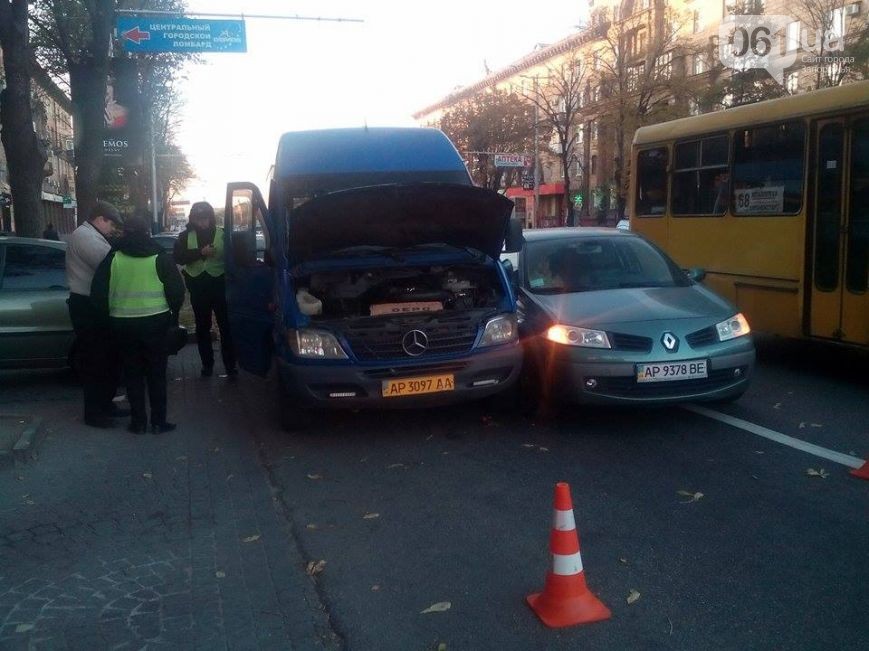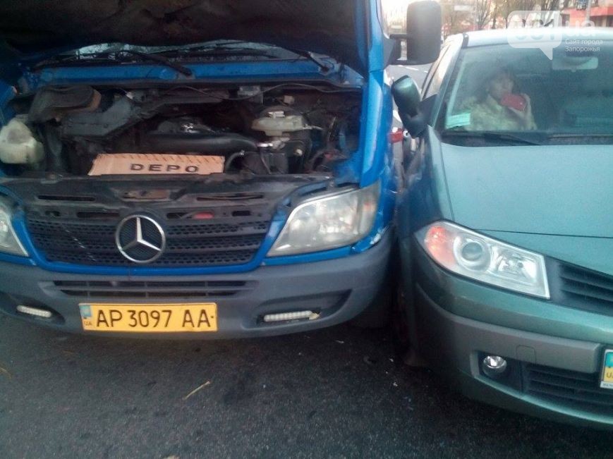 Сегодня, 26 октября, в Запорожье между Сталеваров и площадью Маяковского автомобиль «Рено» столкнулся с маршруткой.