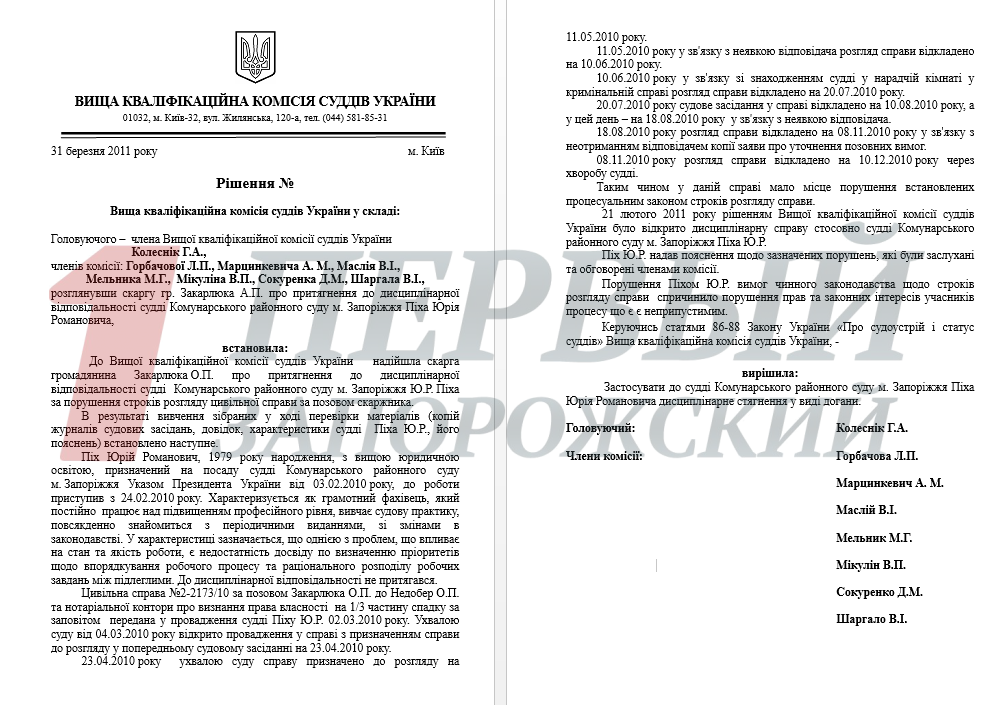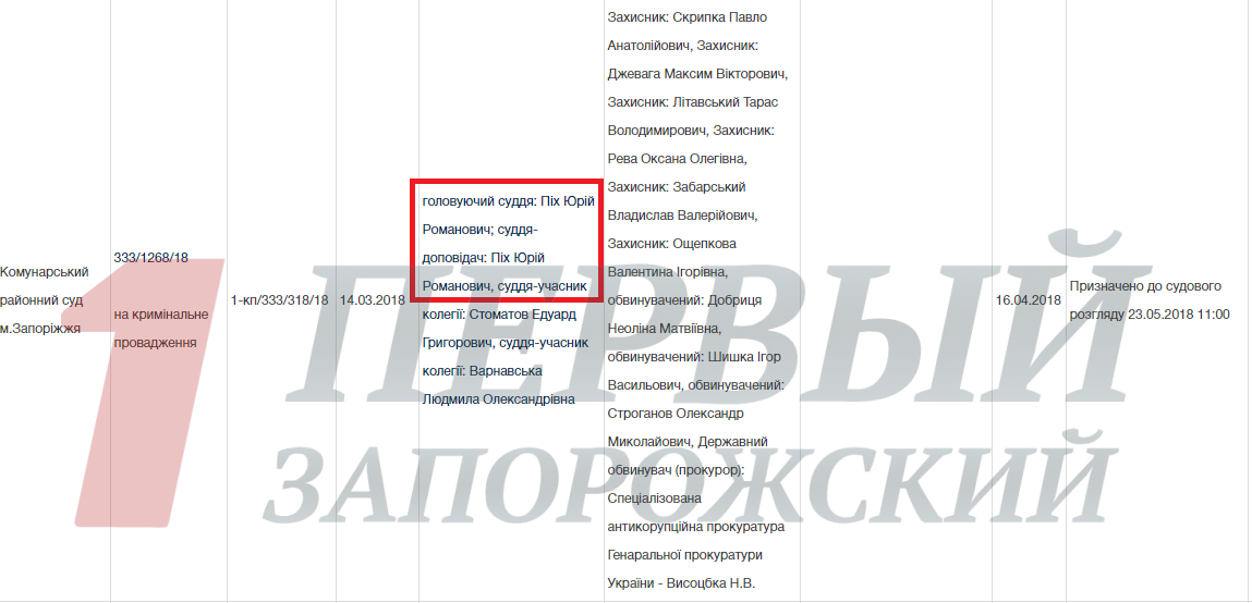 Известно, что судья с 2010 по 2015 год возглавлял Коммунарский районный суд. Высший Совет Правосудия в мае прошлого года готовил представление Президенту Украины о назначении Пиха на должность судьи Коммунарского районного суда города Запорожья, но в настоящий момент главой суда остается Фунжий.