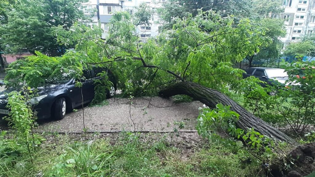 В разных районах города ливни повымывали корни деревьев и они теперь падают на припаркованные машины.