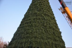 В настоящее время коммунальщики с помощью крана поднимают елку и монтируют нижнюю часть металлического каркаса. Речь идет о металлической конструкции в виде конуса, на которую «надевают» зеленые ветви. Высота елки — 24 метра. Коммунальщики обещают смонтировать елку весом в течение сегодняшнего дня, а уже завтра приступят к украшению зеленой красавицы новогодними игрушками.