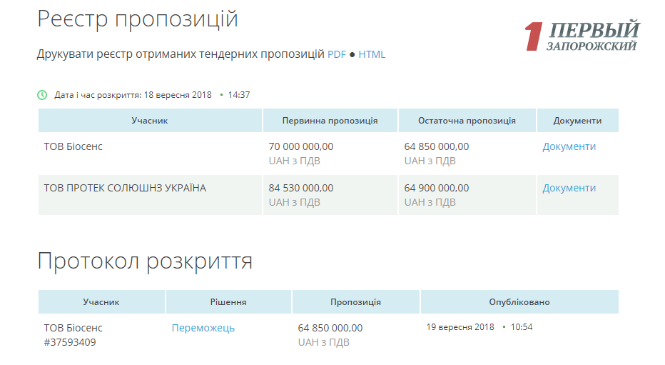 Изначально онкодиспансер готов был выложить за данную аппаратуру 80 миллионов гривен, но в ходе аукциона удалось сбросить цену до 64,8 миллионов гривен. Единственным конкурентом «Биосенса» выступила ««Протек Солюшнз Украина», которая выступает дистрибьютором американской группы компаний GE Healthcare. С разницей в 50 тысяч победу одержал «Биосенс».