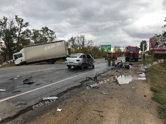 Авария произошла буквально перед самым въездом в Мелитополь. Лоб-в-лоб столкнулись ВАЗ-2112 и грузовик MAN, зацепив проезжающий Mercedes GL.