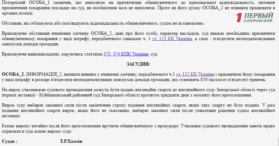 После рассмотрения всех обстоятельств дела, суд всё же признал сержанта полиции виновным в превышение служебных полномочий без видимых причин и присудил штраф в 850 гривен.