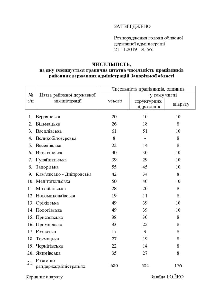 До конца года 20 районных государственных администраций Запорожской области должны сократить 680 сотрудников. Приказ о сокращении подписал глава Запорожской облгосадминистрации Виталий Туринок.