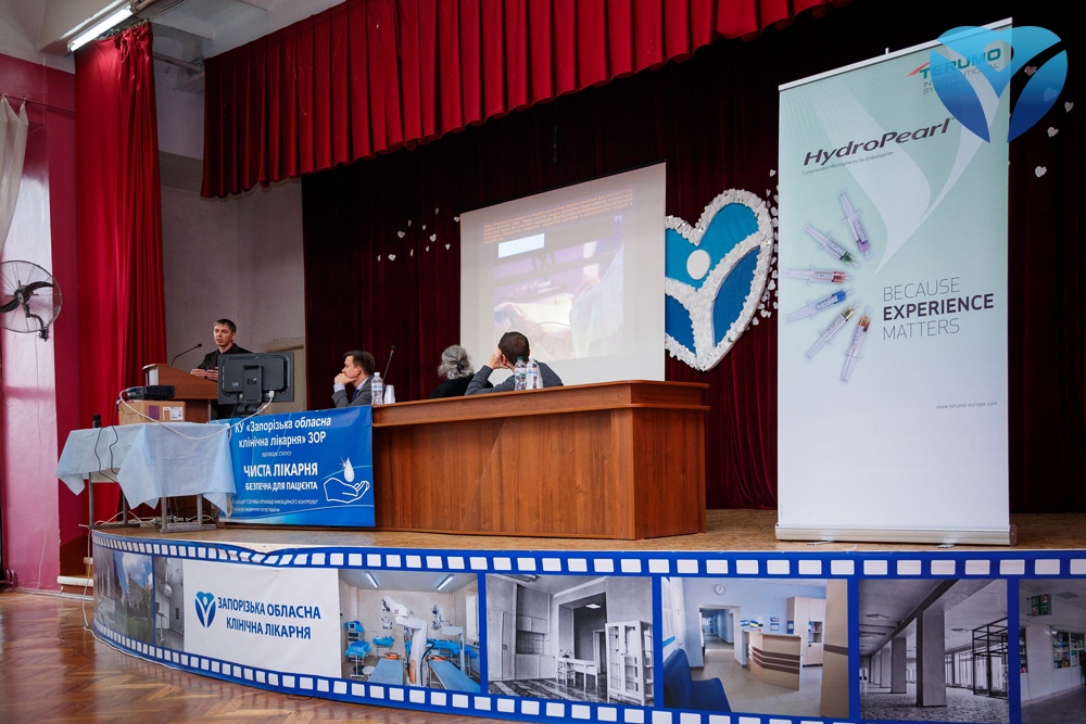 Завершил лекционную часть Дмитрий Руденко, эндоваскулярный хирург Запорожской областной больницы, ассистент кафедры урологии и лучевой диагностики ЗГМУ. Он выступил перед присутствующими с докладом о новом этапе в развитии лечения миомы — эмболизации маточных артерий (ЭМА).