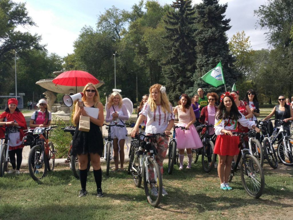 Стартовали прекрасные дамы с площади Маяковского и доехали до парка «Дубовая роща». Главным условиям было прокатиться на двухколесном коне в необычном костюме – будь-то платье и каблуки, тематический костюм или просто что-то оригинальное на собственный вкус