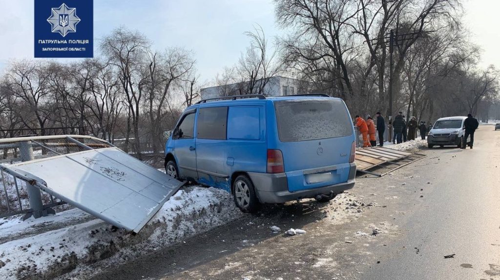 В результате столкновения автомобиль Mercedes Vito продолжил неуправляемое движение, сломал ограждение и едва не вылетел с моста.