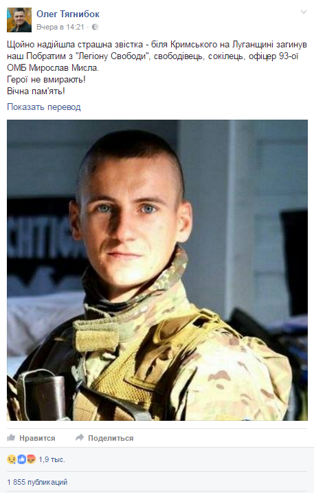 О гибели парня сообщил лидер ВО «Свобода» Олег Тягнибок на своей странице в Facebook.