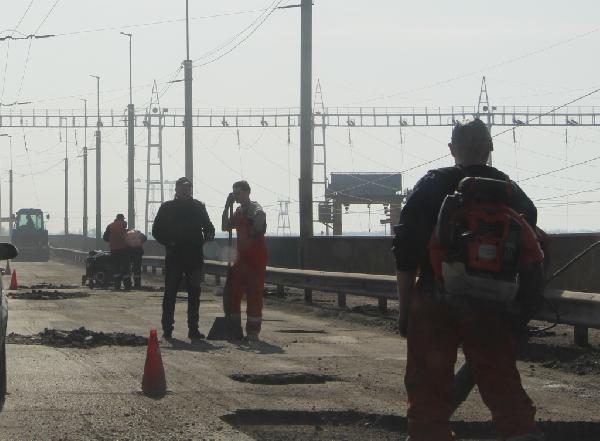 Сегодня на участке задействовано восемь единиц спецтехники и 14 рабочих предприятия. Чтобы не перекрывать полностью движение по плотине работы ведутся только на одной полосе, одновременно с двух сторон.