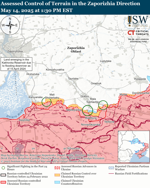 13 и 14 мая российские войска атаковали к юго-востоку от Орехова в направлении Малой Токмачки; к югу от Орехова в направлении Новоданиловки; и юго-западнее Орехова вблизи Степового, Щербаков и Каменского Запорожской области.