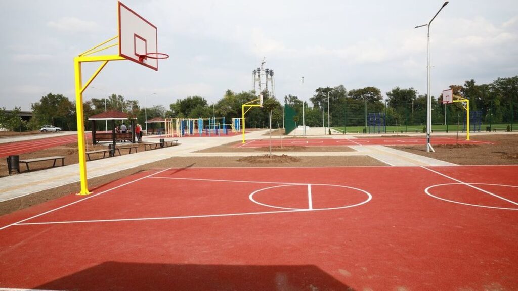 Уже построены тренировочное поле для футбола 40х60 м с покрытием искусственным газоном; две баскетбольных и две волейбольных площадки; гимнастическая площадки; беговые 100-метровые дорожки с резиновым нескользким покрытием; площадка для прыжков в длину.