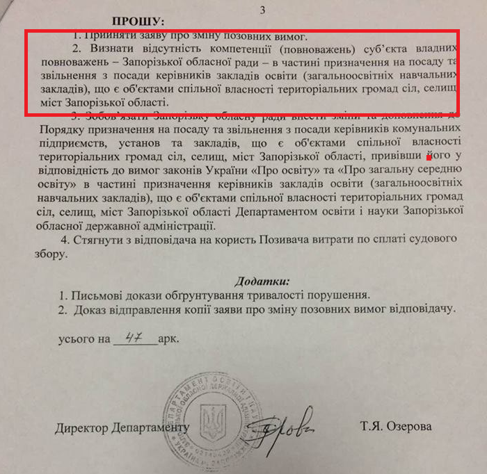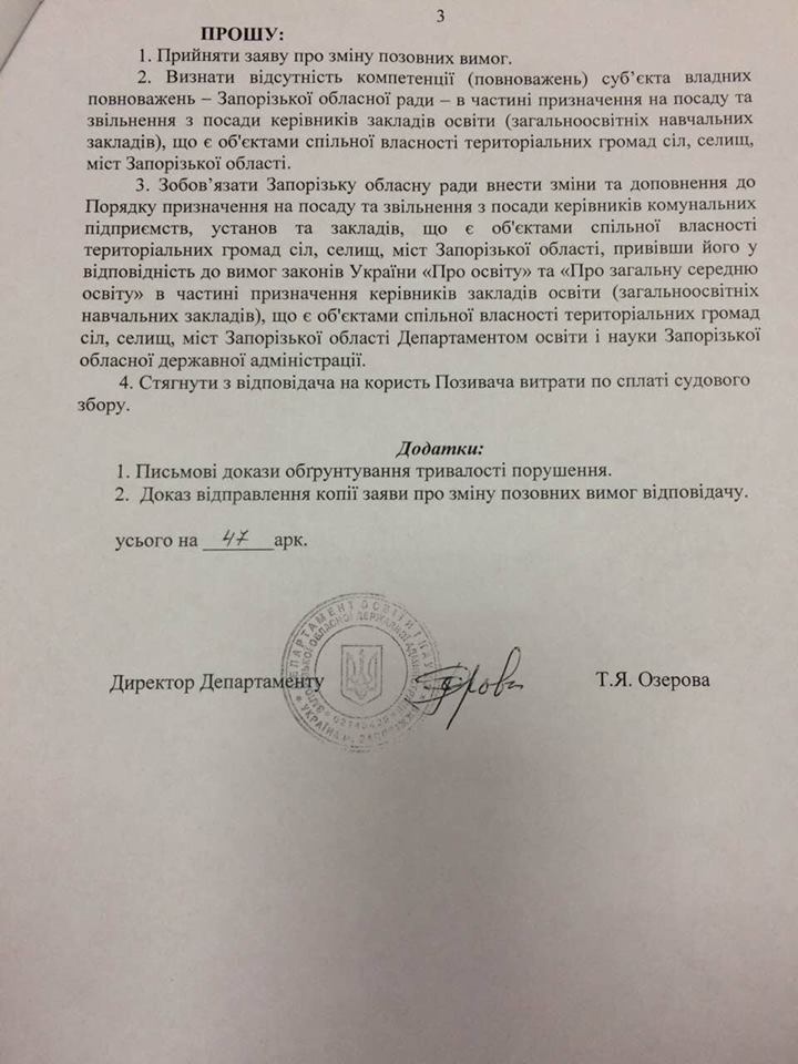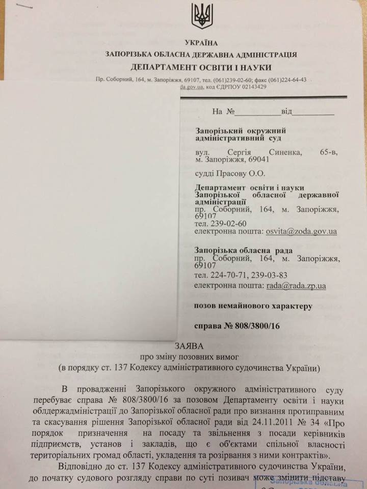 Департамент образования и науки Запорожской облгосадминистрации направил в суд заявление об изменении исковых требований. Не то, чтобы чиновники из ОГА передумали судиться с областным советом: просто в связи с последними событиями и уже утвержденными решениями чиновники решили усилить атаку.
