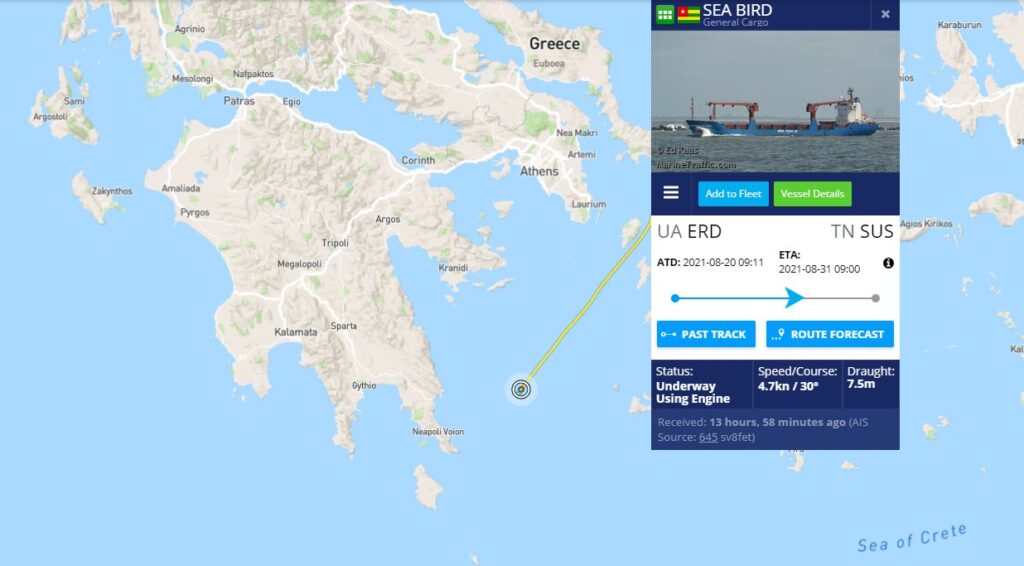 Ливанский сухогруз SEA BIRD под флагом Того с сирийским экипажем, который шел с 7000 тонн пшеницы из Бердянска в Тунис, затонул на восточном побережьи Греции после столкновения с другим судном.