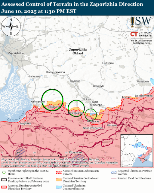 Войска РФ 10 июня вели наступательные действия на западе Запорожской области, но не продвинулись.