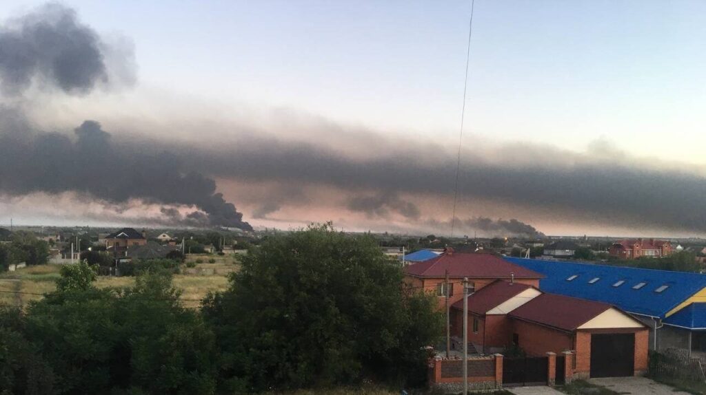 База российских военных горит по сегодняшний день. В результате удара рашисты потеряли много живой силы и техники.
