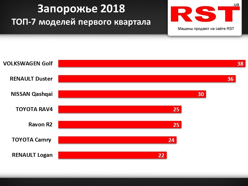 Как сообщает аналитический отдел сайта по продаже автомобилей RST.ua, чаще всего в Запорожье покупали авто марки Renault. Таких автомобилей зарегистрировали 86 единиц на сумму более 1,4 миллиона долларов. Кроме этого, на 81 автомобиль Toyota потратили 3 миллиона долларов, если не учитывать стоимость дополнительного оборудования. А среди моделей лидером по количеству проданных авто стал Volkswagen Golf. Если же рассматривать по сумме покупок, то лидирует Toyota Land-Cruiser. На 12 внедорожников потратили около миллиона долларов.