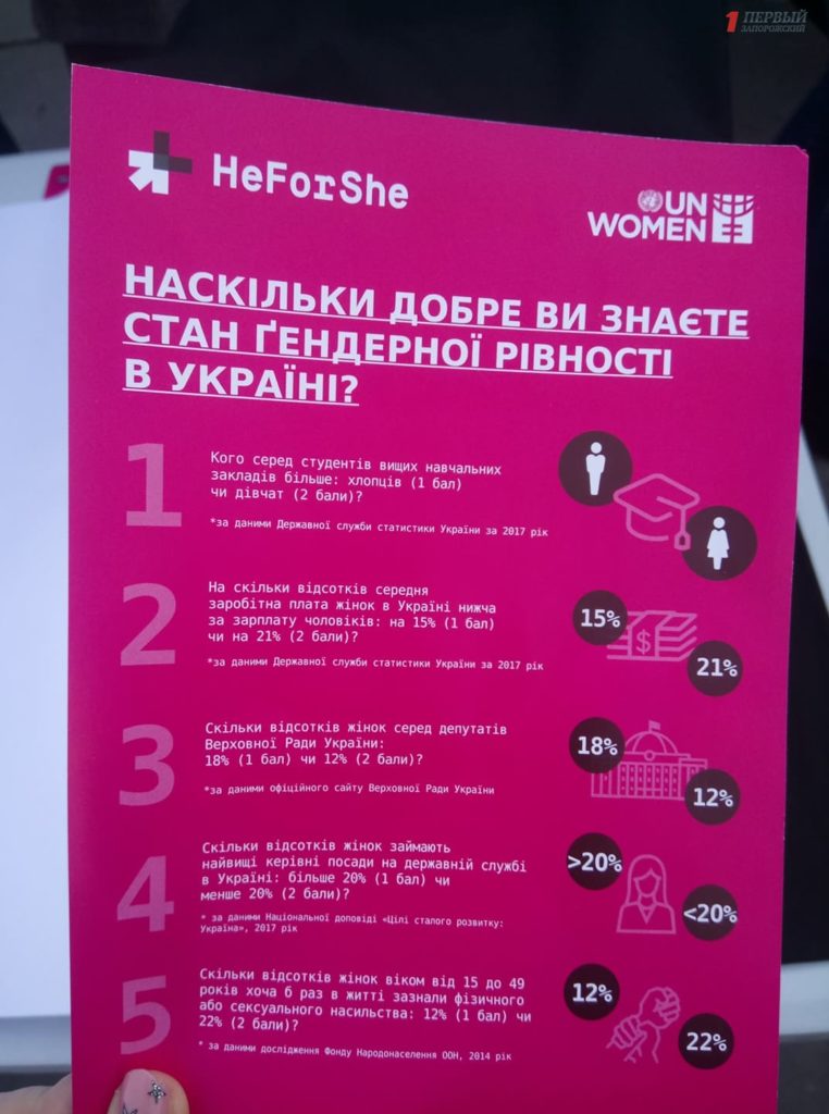 Кроме этого общественная организация «Gender Zet» предлагает запорожцам и гостям города пройти тест на гендерное равенство, чтобы оценить реальный уровень гендерного равенства в Украине.