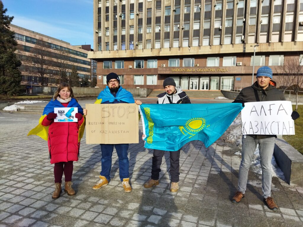 Житель Запорожья Игорь Лукашенко опубликовал фото из акции. Организаторы говорят, что вышли выразить поддержку, потому что «сейчас в Казахстане проходят протесты по тем же причинам, что и в Украине в 2014 году».