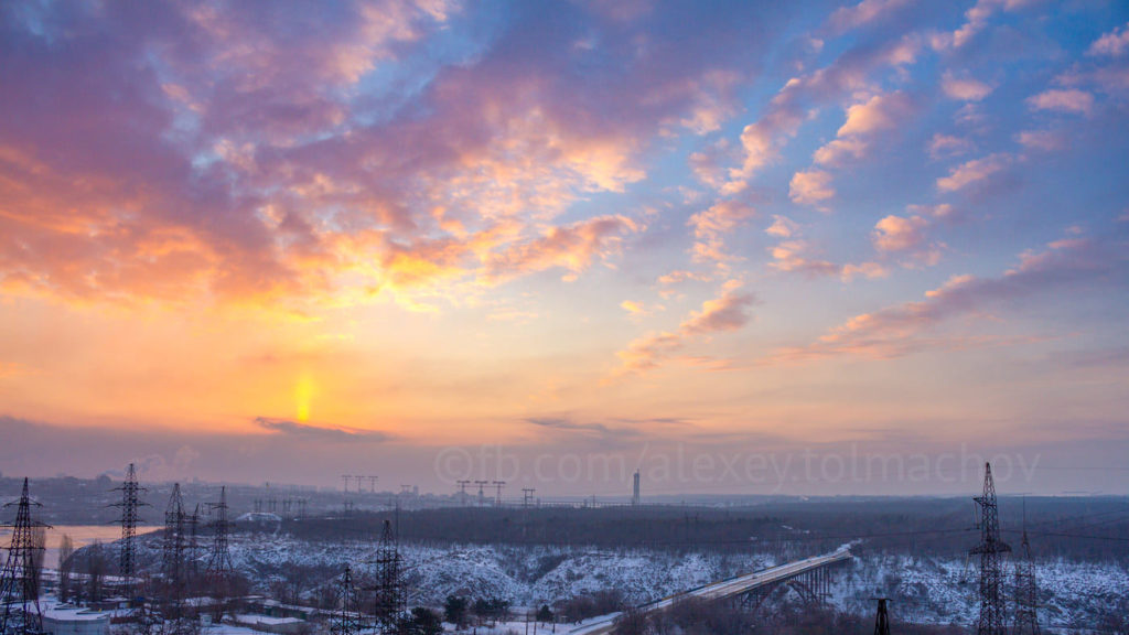 Сегодня на рассвете в небе над Запорожьем можно было наблюдать красивое атмосферное явление, которое называется «солнечный столб» (Sun Pillar). Столб формируется благодаря кристаллам льда в атмосфере, которые отражают солнечный свет во время восхода или заката.