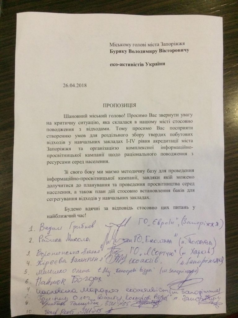 Организаторы мероприятия подготовили предложение мэру города Владимиру Буряку. Волонтеры хотят создать в местных учебных заведениях условия для раздельного сбора твердых бытовых отходов и организовать комплексную информационно-просветительскую кампанию относительно рационального поведения населения с ресурсами.