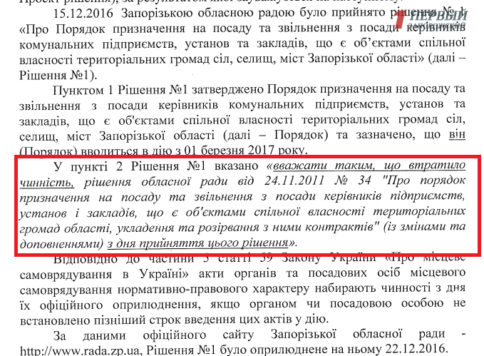 В управлении юридического обеспечения деятельности совета исполнительного аппарата Запорожского облсловета утверждают, что в одночасье отменить нынешний порядок и возобновить старый никак не получится, потому что с юридической точки зрения с 15 декабря 2016 года, когда вступил в силу новый порядок, предыдущий утратил силу. Об этом свидетельствует пункт 2 решения №1 «Про порядок назначения на должность…», где написано, что предыдущий порядок потерял силу с дня принятия этого решения.