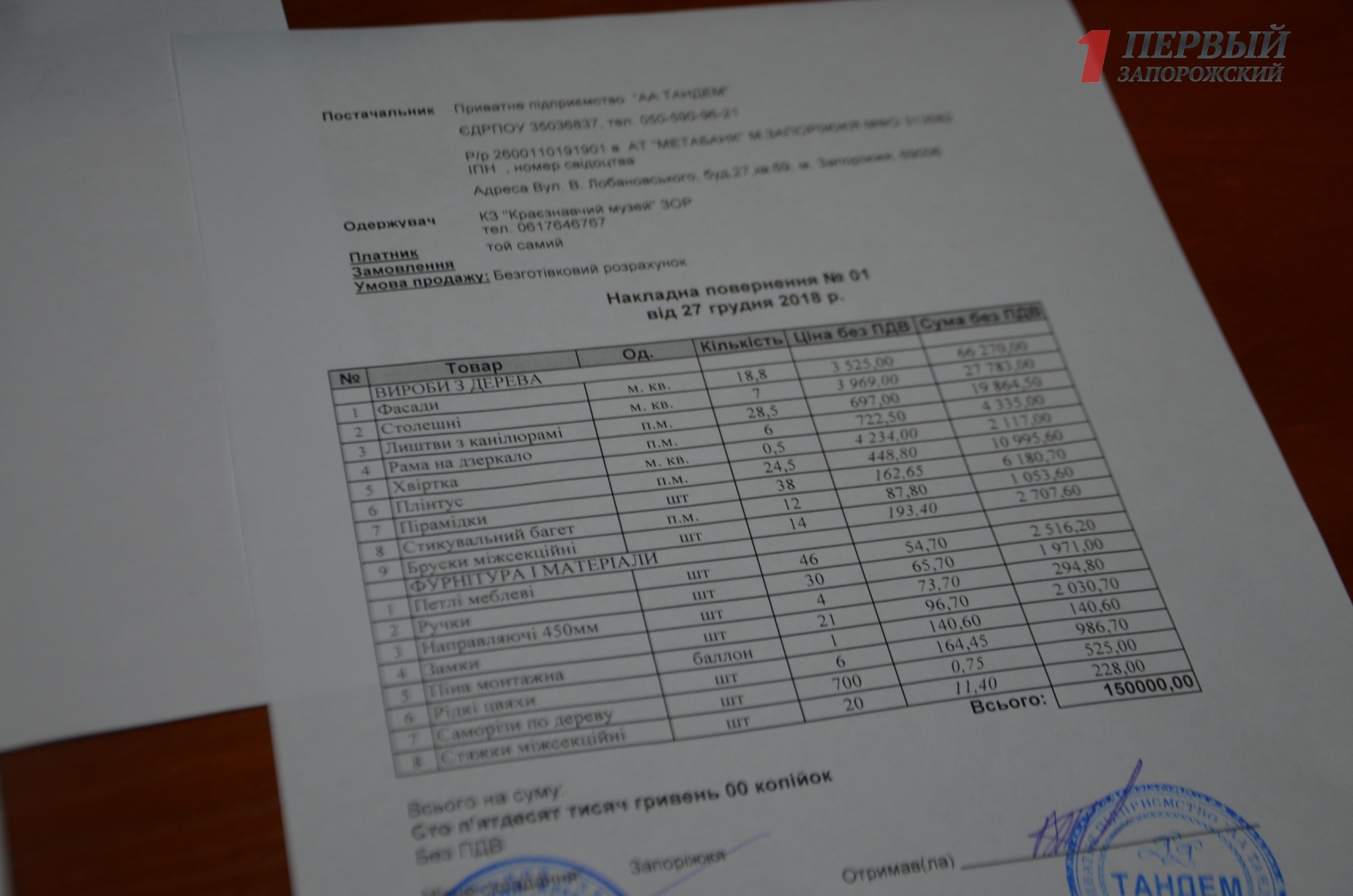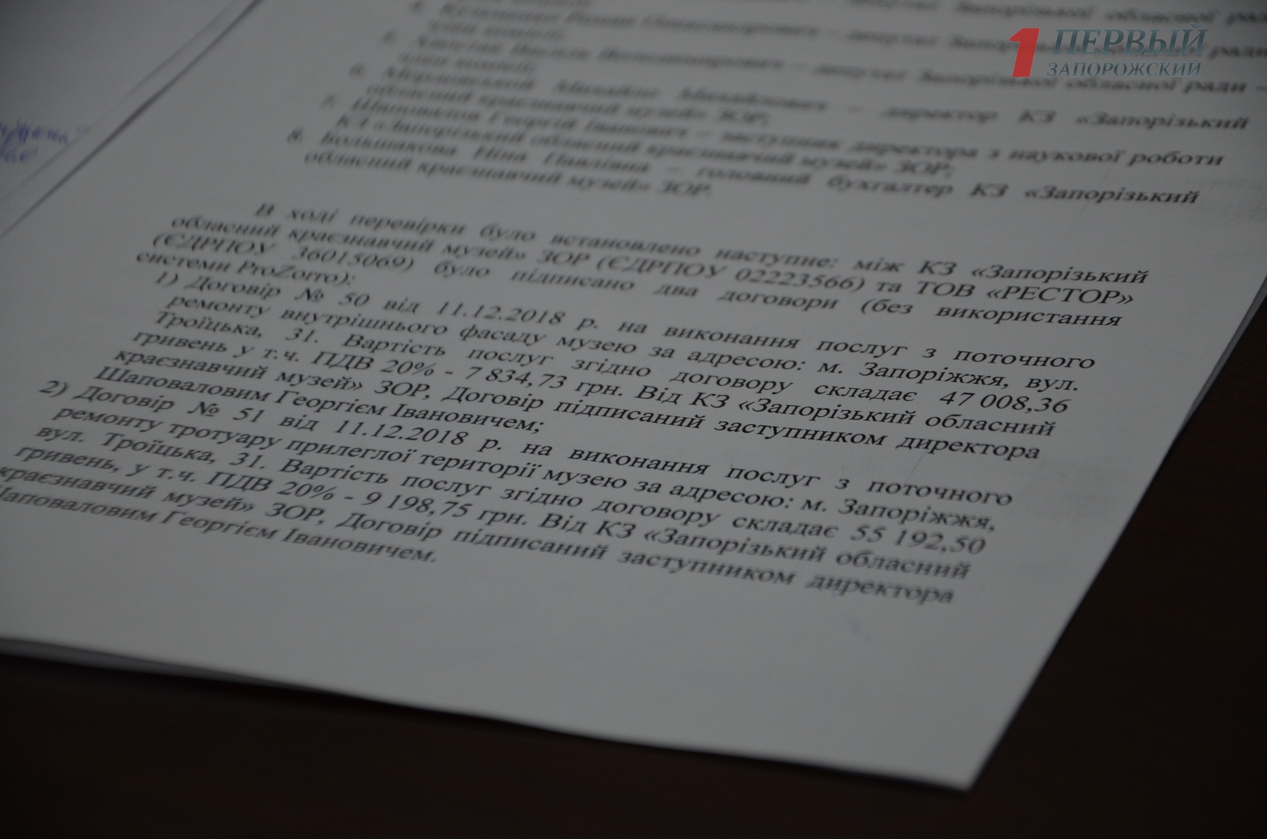 — Запорожский областной краеведческий музей обратил внимание депутатов тем, что уже на протяжении трех лет не использует систему «Prozorro» для осуществления закупки работ или услуг. В связи с этим глава Запорожского областного совета издал распоряжение по проверке деятельности музея. Сегодня мы совместно с депутатами рассмотрели первый документ о выполненных работах по обустройству тротуара и реконструкции внешнего фасада. Договор был подписан 11 декабря прошлого года и уже через неделю были подписаны акты о выполнении работ и перечислены деньги в полном объеме при том, что они не были фактически выполнены, — рассказал член комиссии и депутат областного совета Ярослав Крыль.