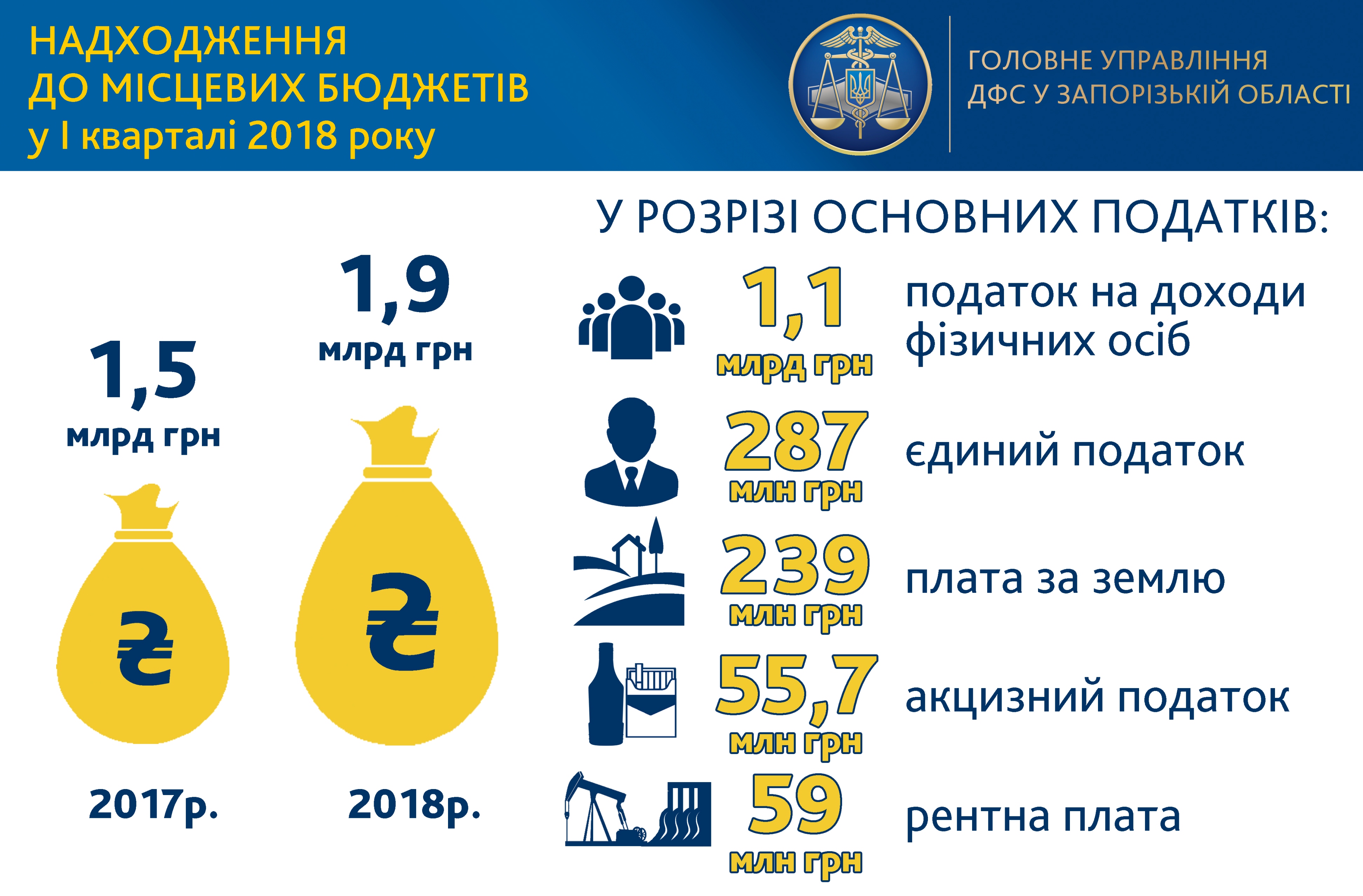 За первый квартал 2018 году до местных бюджетов Запорожской области поступил 1 миллиард 863 миллионов гривен налогов и сборов (без показателей крупных налогоплательщиков, которые учитываются в Запорожском управлении Офиса КНП ГФС).