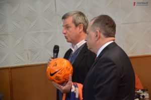 Напоследок Колесников, как вице-президент ФК «Шахтер»вручил директору лицея неожиданный презент- футбольный мяч и футболку с эмблемой «Шахтера».