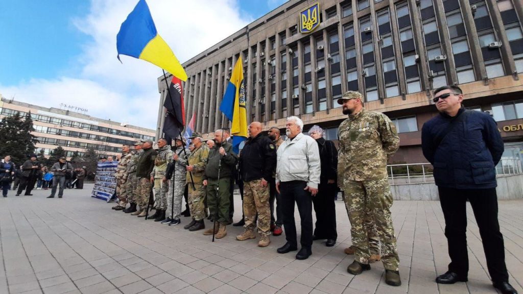 Ветераны войны на Донбассе – военнослужащие батальона «Донбасс», «Правого сектора», «Азова», ЗСУ – собрались на площади Героев, что перед зданием Запорожской облгосадминистрации, чтобы возложить цветы перед памятником Героям Революции.