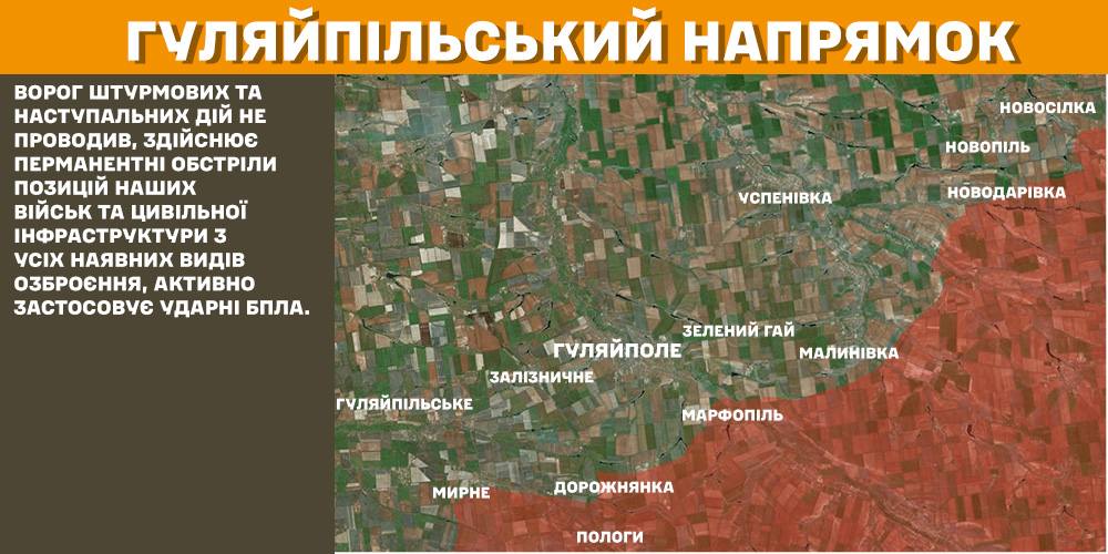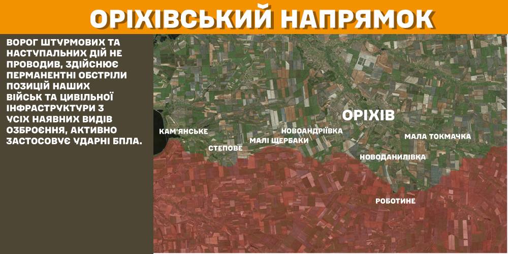 На Гуляйпольском и Ореховском направлениях враг штурмовых и наступательных действий не проводил. Однако осуществляет перманентные обстрелы позиций украинских войск и гражданской инфраструктуры из всех имеющихся видов вооружения, активно применяет ударные БПЛА.