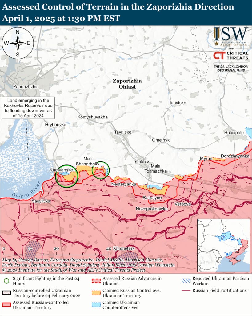 31 марта и 1 апреля в Генштабе ВСУ сообщали, что войска РФ наступали севернее Работино в районе Новоданиловки и северо-западнее Работино в районе Малых Щербаков, Лобкового, Щербаков, Каменского и Степового.