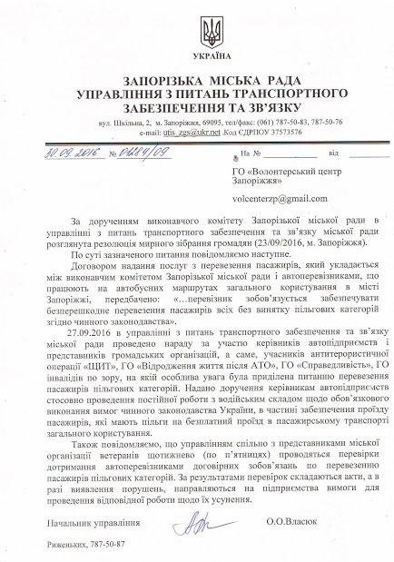 Сегодня, 3 октября, заместитель председателя общественного объединения «Волонтерский центр Запорожье» Константин Денисов получил ответ от управления транспорта и связи городского совета относительно бесплатного проезда для участников АТО.