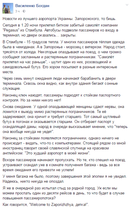 Запорожский журналист Богдан Василенко рассказал в соцсети Facebook, как сонные работники бегали внутри здания и долго не могли принять опаздывающих пассажиров.