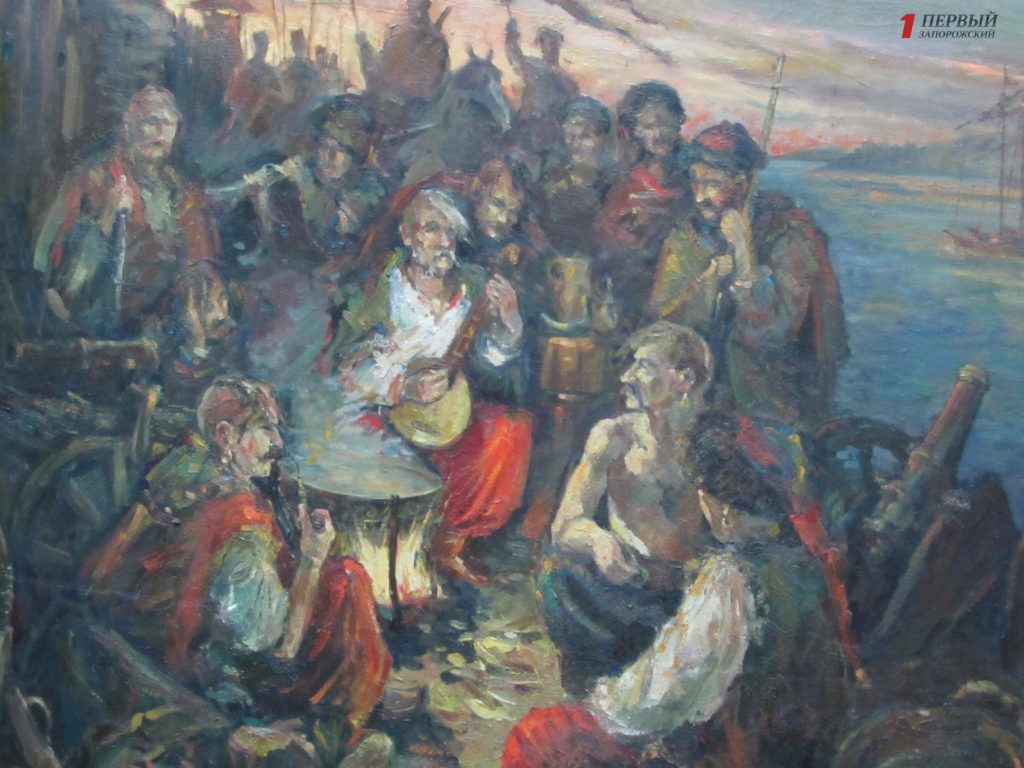 — «Спів характерника» показывает бытовую жизнь Запорожской Сечи. Одним из главных персонажей полотна является наш известный художник, характерный кобзарь — Александр Стариковский. Он позировал, а также принимал активное участие в консультации композиции, — отметил Евгений Прокофьев.