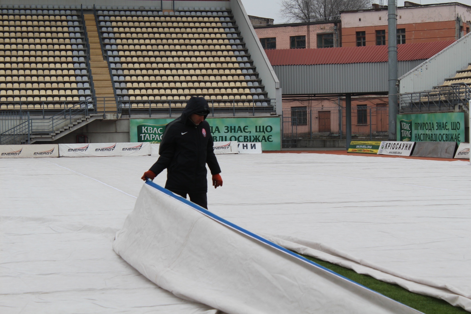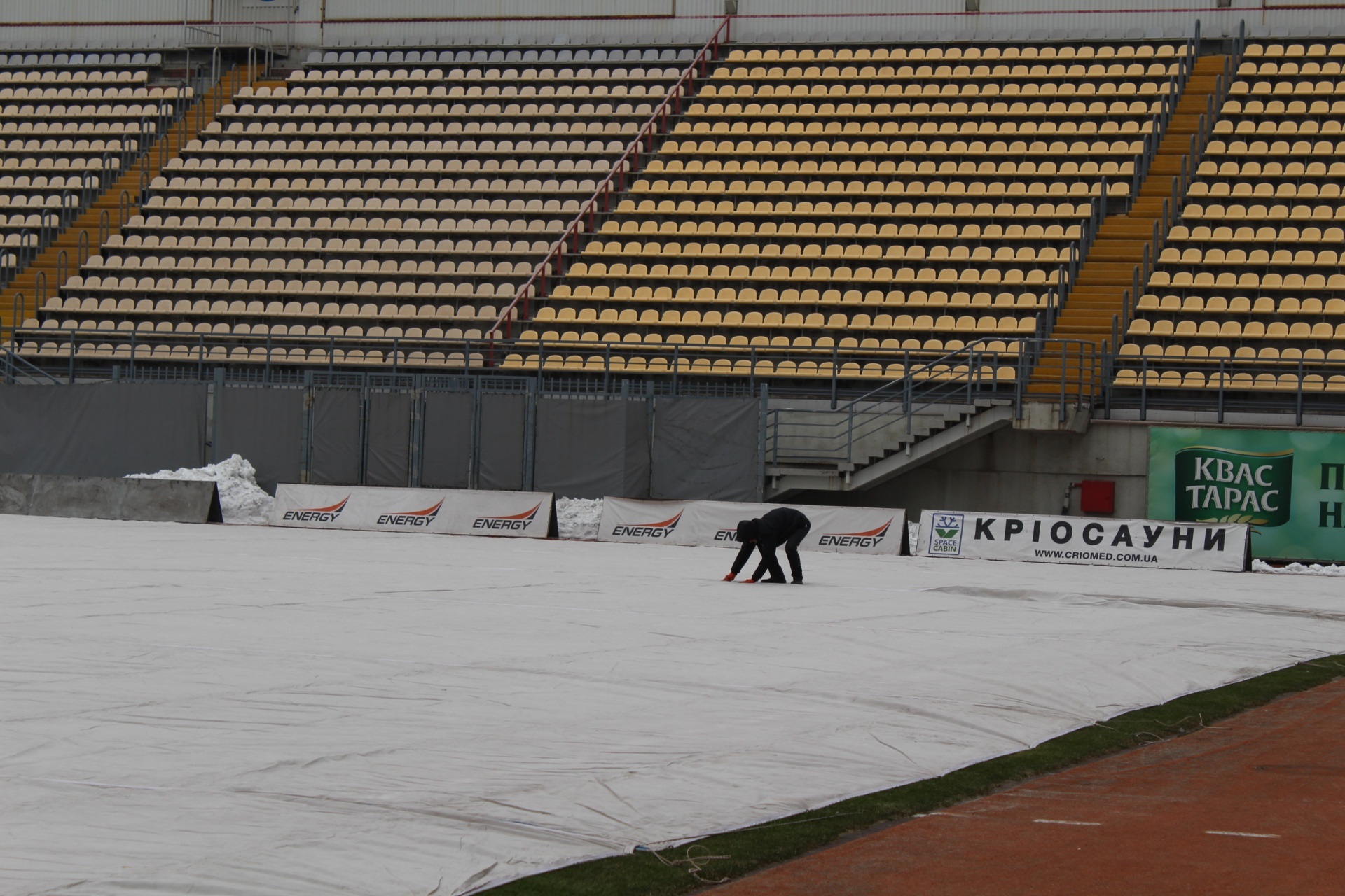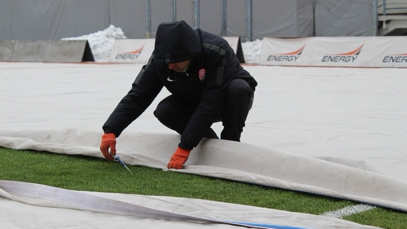 В преддверии матча основная работа ведется по подготовке футбольного поля. Сейчас газон накрыт специальным агроволокном, включен подогрев. Как рассказал ведущий агроном КП «Городской футбольный клуб Металлург» Дмитрий Зиновьев, подогрев покрытия осуществляется с помощью антифриза. Это так называемый «жидкостный подогрев».