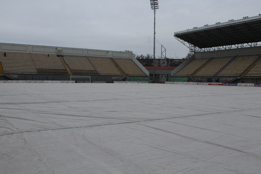 В преддверии матча основная работа ведется по подготовке футбольного поля. Сейчас газон накрыт специальным агроволокном, включен подогрев. Как рассказал ведущий агроном КП «Городской футбольный клуб Металлург» Дмитрий Зиновьев, подогрев покрытия осуществляется с помощью антифриза. Это так называемый «жидкостный подогрев».