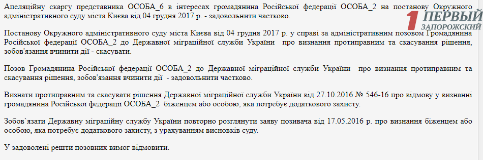 Окружной административный суд Киева в конце прошлого года отказал разыскиваемому в удовлетворении иска по поводу признания противоправным решения не предоставлять ему статус беженца. Указанное постановление адвокаты обжаловали в апелляционном суде. В настоящий момент суд обязал миграционную службу рассмотреть заявление о статусе беженца.
