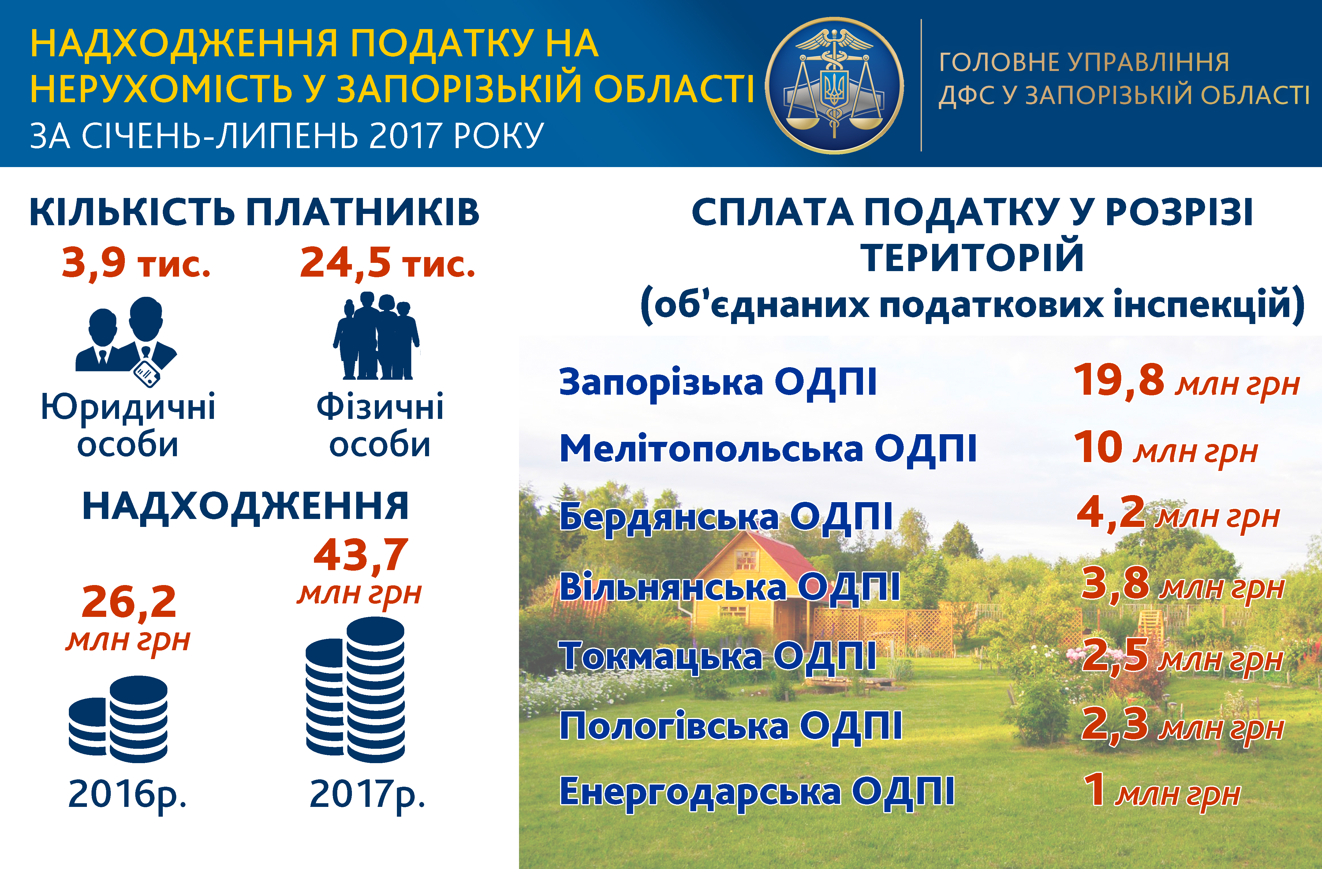 За семь месяцев 2017 года в местные бюджеты Запорожья и области поступило 43,7 миллиона гривен налога на недвижимое имущество. Уровень прошлого года превышен на 17,6 миллиона, а ожидаемую сумму на текущий год — почти вдвое. Об этом сообщили в пресс-службе ГУ ГФС в Запорожской области