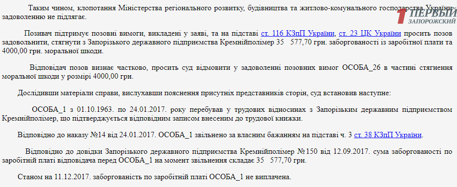 Один из бывших сотрудников «Кремнийпомера», который проработал на предприятии с 1963 года по начало 2017 года, подал иск в Хозяйственный суд Запорожской области с требованием взыскать с Запорожского государственного предприятия «Кремнийполимер» задолженность по заработной плате и моральную компенсацию. Об этом стало известно из реестра судебных решений.