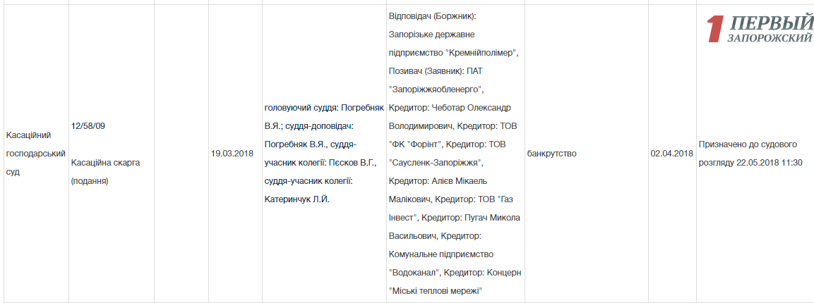 Напомним, что в мае в Кассационном суде будет рассмотрена жалоба ПАО «Запорожьеоблэнерго» на постановление Донецкого апелляционного суда о признании банкротом «Кремнийполимера».