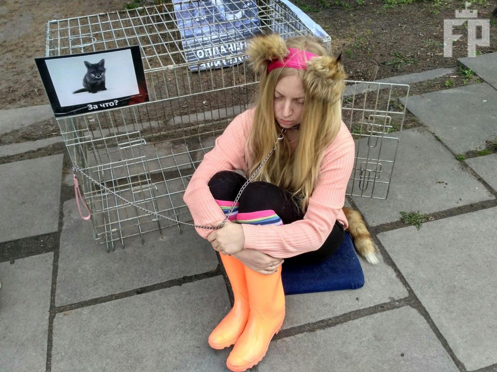 Во время акции запорожская зоозащитница Олеся Кулык приковала себя цепью к клетке, после чего залезла в нее, продемонстрировав во что превращается жизнь животного в цирке.