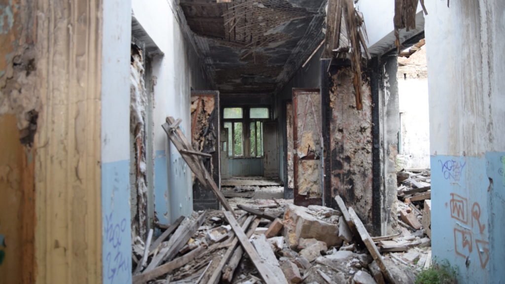 Мебели внутри тоже практически нет, кое-где можно увидеть перевернутые тумбочки. На окнах разбиты все стекла, в некоторых местах нет пола. Перила, на центральной лестнице, которые поначалу служили эффектной фотозоной, полностью снесли.