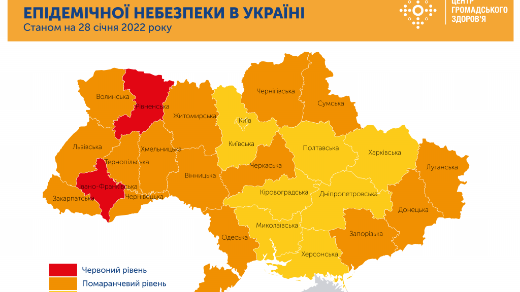 Станом на 28 січня червоний рівень епіднебезпеки розповсюдження COVID-19 запроваджено в Івано-Франківській та Рівненській областях. У 15 областях – «помаранчевий» рівень, у 7 областях та Києві – «жовтий».