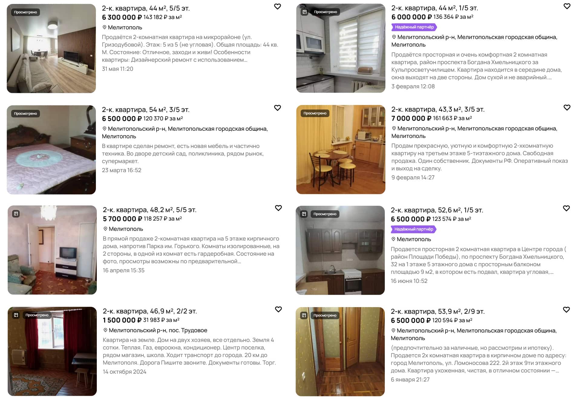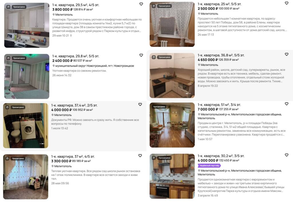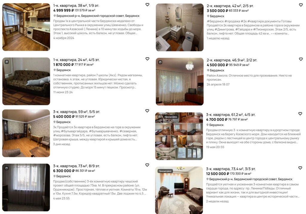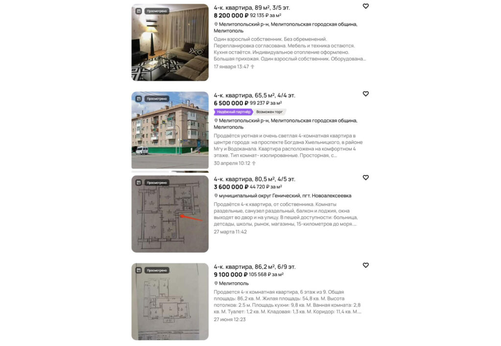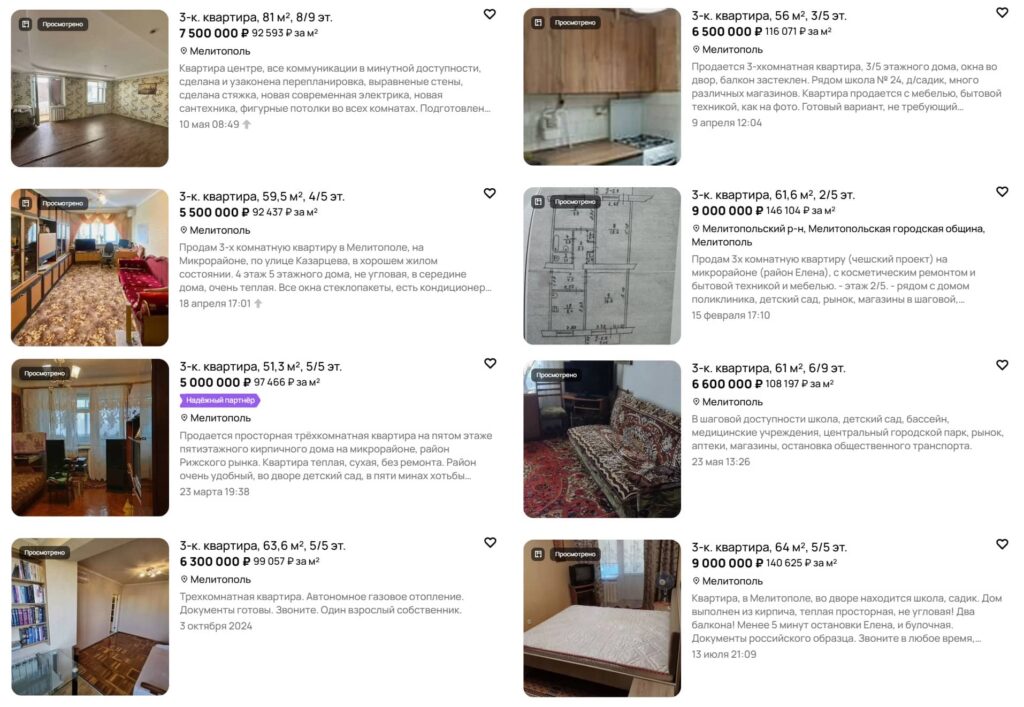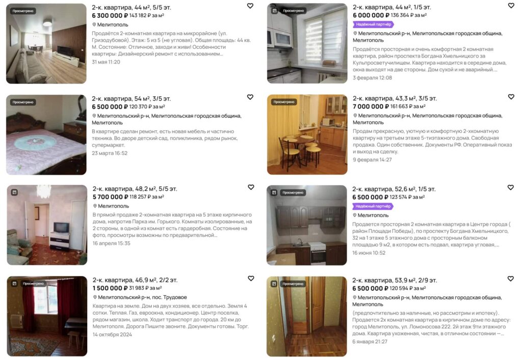 На російських платформах з продажу нерухомості та в телеграм-каналах з’являються десятки оголошень про продаж квартир на тимчасово окупованих територіях Запорізької області. У пропозиціях трапляються як старі «хрущовки» на околицях, так і просторі п’ятикімнатні квартири в центрі з сучасним ремонтом. Вартість житла суттєво коливається залежно від міста, розташування, технічного стану, а також наявності меблів і побутової техніки.