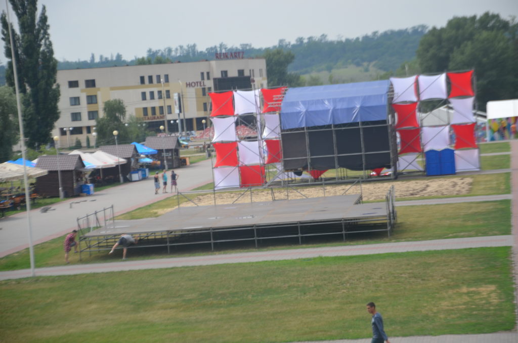 Кроме этого в настоящий момент десятки рабочих трудятся над монтажом сцены и подключением музыкальной аппаратуры в «Славутич-арене», где завтра с 19:000 ожидается праздничный концерт с участием Ottawan, La Bouche, Монатика и Евгения Хмары. Вход только по пригласительным билетам.