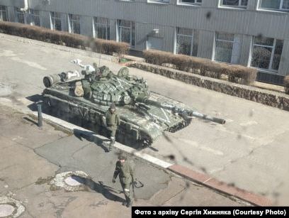 «На станції є бомбосховище, але це режимний об’єкт. Нас в жодному випадку не могли туди пустити. Відповідно, оскільки були постійно повітряні тривоги, було чути, як летять чи-то ракети, чи-то літаки, інженер станції запропонував нам спуститися до підвалу. Поки ми були у цій кімнаті, всю інформацію ми могли збирати лише за вібрацією стін, звуках, які чули. Довгий час було тихо, потім чути було, як якась важка техніка їздить. За звуком важко зрозуміти, що за техніка, чия вона, тому ми домислювали різне. Інженер станції довго не повертався. Нам він сказав: «Я прийду до вас близько шостої». На початку десятої він спустився до нас і каже: «Ситуація дуже важка – станція захоплена», — згадує Сергій Хижняк.