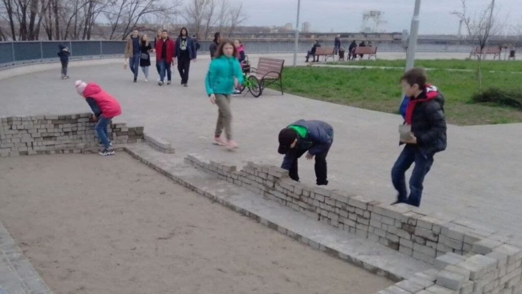 На Правобережному пляжі декілька дітлахів гралися з тротуарною плиткою, намагаючись спорудити із неї щось накшталт фортеці. Почали вони бавитися, коли на вулиці ще був день, а останнє фото зроблено вже у сутінках, тобто діти там провели декілька годин, серйозно підійшовши до “будування”.