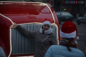 К фургону сразу же сбежались десятки запорожцев, чтобы сфотографироваться с Санта-Клаусом, и белыми медведями и получить в подарок сладкие призы.